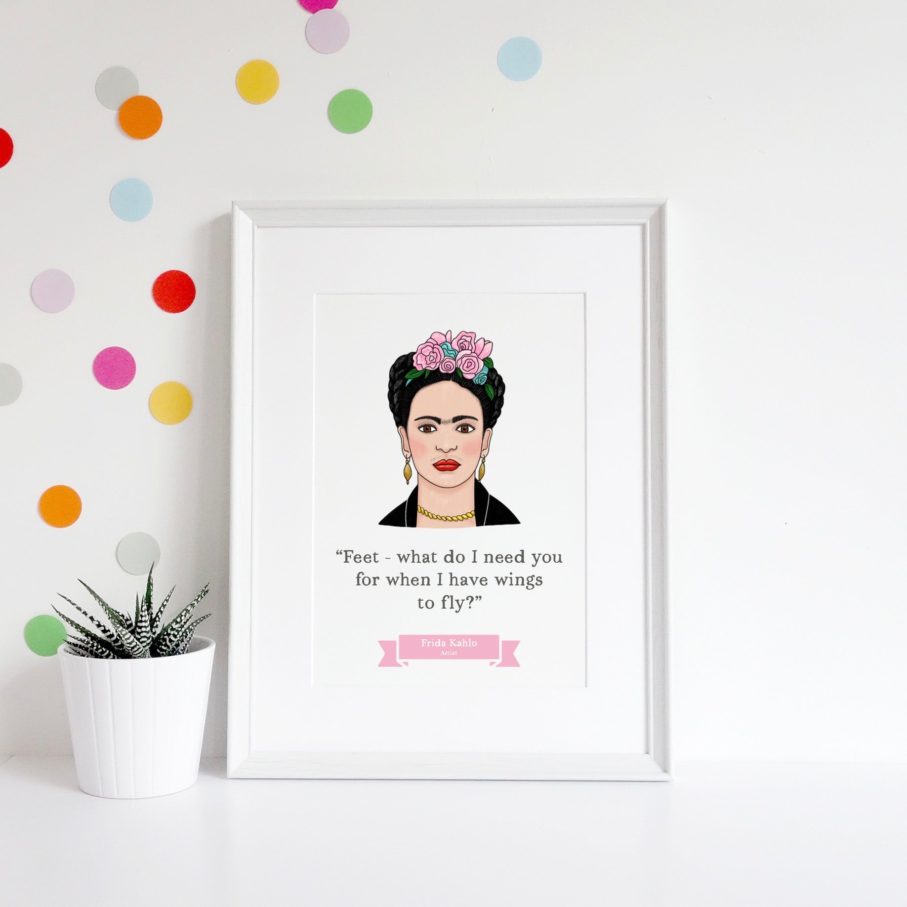 A beautiful wall art print featuring a quote and hand drawn illustration of one of history's most inspiring women - the famous artist Frida Kahlo. Frida's bold, bright and colourful self portraits have become a symbol of feminism and self expression across the whole world, and are instantly recognisable.